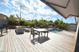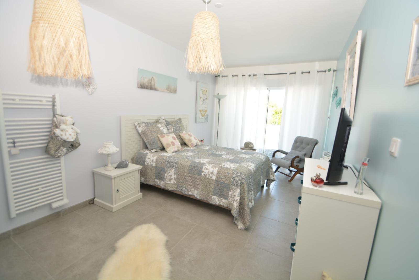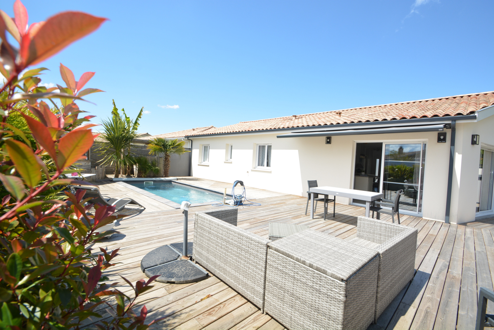 À VENDRE , MAISON "contemporaine", de construction "traditionnelle", mitoyenne d'un côté, lumineuse, très bien entretenue, saine et habitable de suite, composée de 5 pièces principales, de plain-pied et agencée comme suit : ENTRÉE, SÉJOUR/SALON donnant sur terrasse avec piscine, CUISINE « américaine » aménagée, CELLIER, COULOIR DE DÉGAGEMENT, 3 CHAMBRES dont 1 avec placards, SUITE PARENTALE avec SALLE D’EAU ouverte, SALLE DE BAINS "complète et W.C. indépendant avec lave-mains et fenêtre + Piscine enterrée, 5X3 (=liner), fond plat (=1,50 m), au chlore , avec alarme amovible + son Local technique, Terrasse bois (= pin maritime classé), donnant sur une jolie parcelle de terrain paysager et clôturée de 423 M². Situation attractive : dans un secteur résidentiel calme, en plein cœur du Bourg. Proche commerces, écoles, collège, Lac et pistes cyclables; À 12 Km de l’Océan…