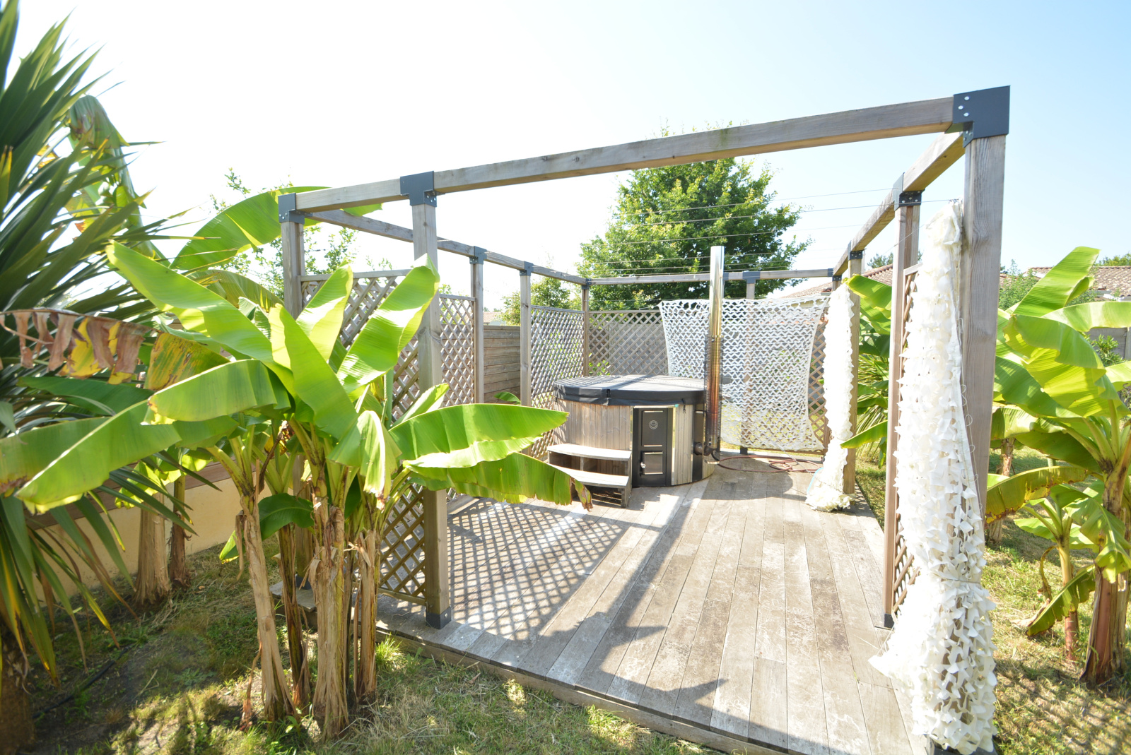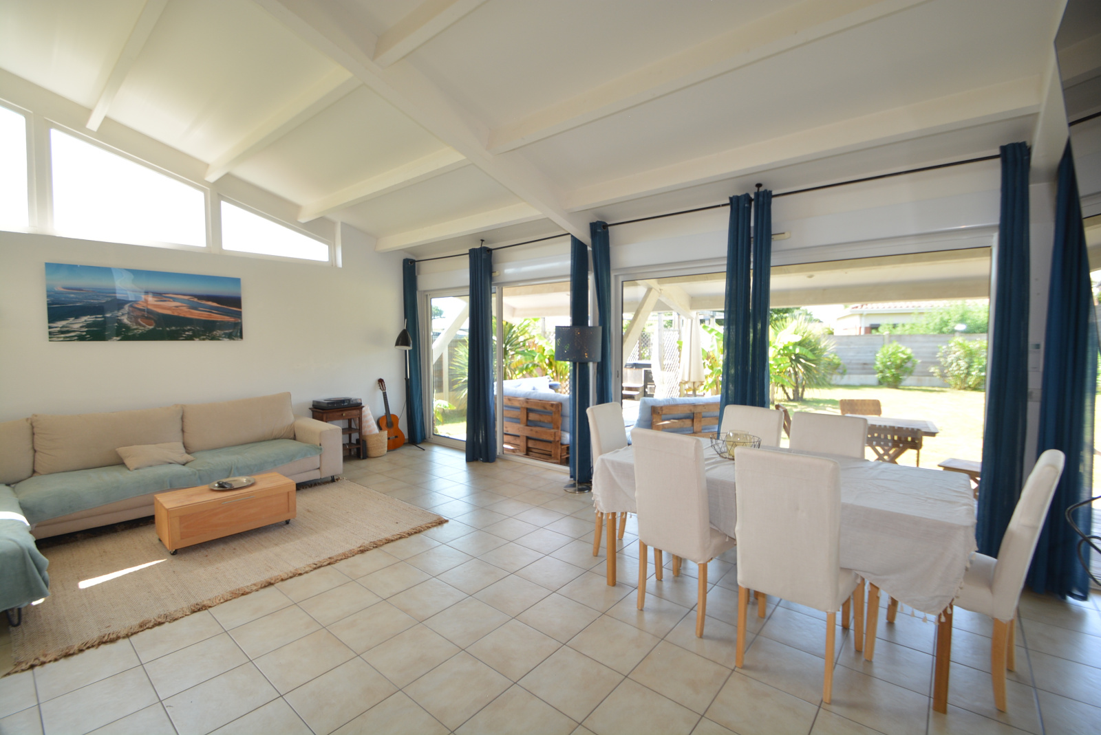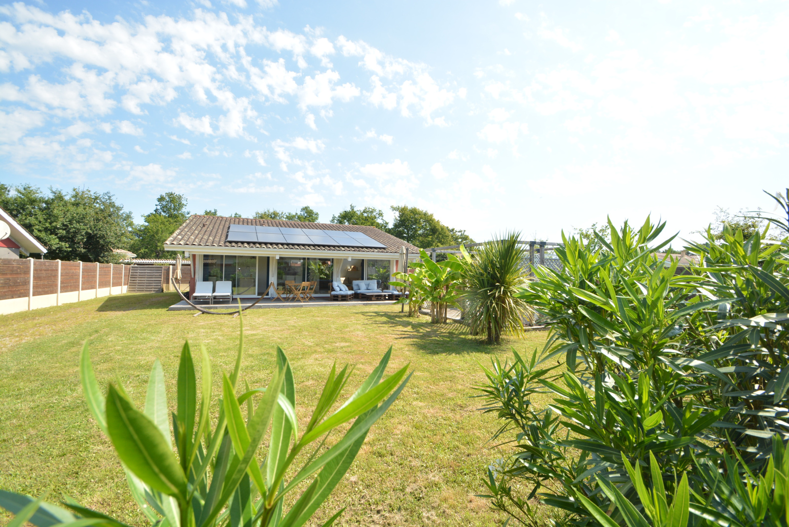 À VENDRE , Jolie MAISON de style "Girolle" de 74,96 m², composée de 3 pièces principales + mezzanine, lumineuse et à l'agencement optimisée et agencée comme suit : ENTRÉE/DÉGAGEMENT avec placards, SÉJOUR/SALON donnant sur terrasse couverte, CUISINE « américaine » aménagée donnant sur terrasse couverte, CELLIER, 2 CHAMBRES dont 1 avec placards, SALLE D’EAU avec placards, W.C. indépendant avec fenêtre, MEZZANINE ouverte sur le séjour + Terrasse bois couverte, Cabanon annexe et Bain suédois avec sa plage en bois, de plain-pied donnant sur une parcelle de terrain entièrement clôturée de748 m² voie d’accès avec servitude de passage comprise. Environnement très privilégié = En 3ème ligne, à deux pas du Bourg et de ses commodités, proche des Écoles, maternelle, primaire, avec ramassages scolaires pour Collège et Lycée… Crèche associative dans le « Village »… près de piste cyclable et forêts, proche de l’Océan, du Bassin d’Arcachon et du Lac de Lacanau…